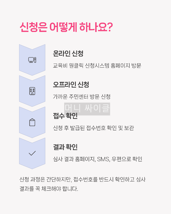 신청 방법은 크게 온라인과 방문 신청으로 나뉩니다. 온라인 신청은 교육비 원클릭 신청 시스템을 통해 가능하며, 공인인증서 또는 공동인증서를 이용해 로그인 후 신청서를 작성하면 됩니다. 방문 신청은 거주 지역의 교육청이나 주민센터에서 직접 할 수 있으며, 신청서를 현장에서 작성하고 관련 서류를 제출하면 됩니다.