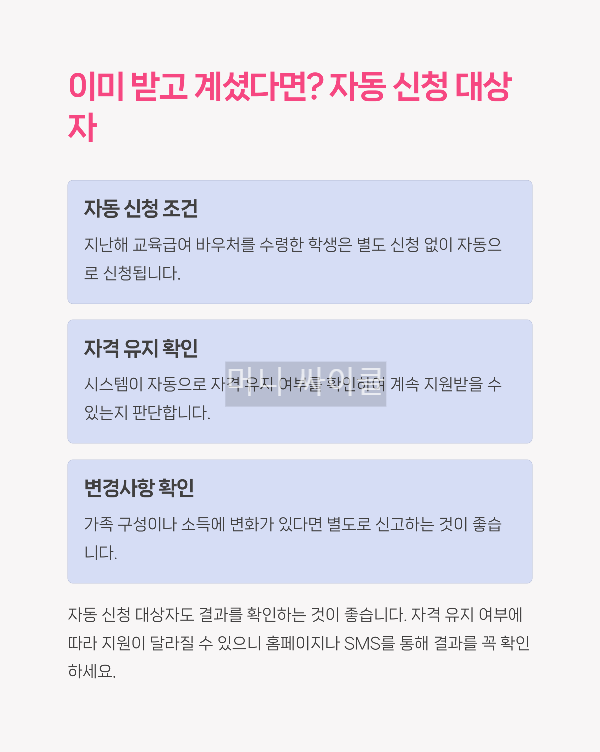 네, 지난해 교육급여를 받았다면 자동 신청됩니다. 단, 선불카드로 지급받았던 경우는 신규 신청이 필요합니다.