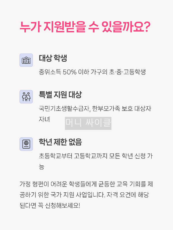 | 지원 대상 | 중위소득 50% 이하 가구의 초·중·고등학생 |